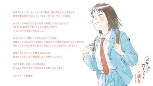 昨年、『スキップとローファー』の著者・高松美咲さんとアフタヌーン編集部が実施した、能登半島地震の被災地支援プロジェクト「スキップとローファーと能登」。その取り組みを告知するため、2024年12月23日に朝日新聞に出稿したのが、今回受賞対象となった新聞広告です。講談社としては、この賞における初のグランプリ受賞となります。