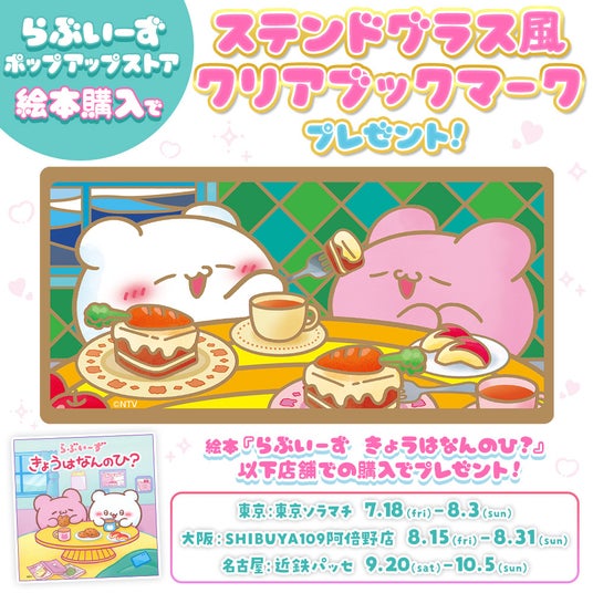 そんなファン必見のポップアップストアで絵本『らぶいーず きょうはなんのひ?』をご購入いただいた方に、「イベント限定 ステンドグラス風クリアブックマーク」をプレゼント!(数量限定/なくなり次第配布終了)