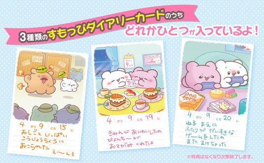 さらにいまなら!えほんに、3種類のすもっぴダイアリーポストカードのどれかひとつが入っているよ! すもっぴの一日をのぞいちゃおう。