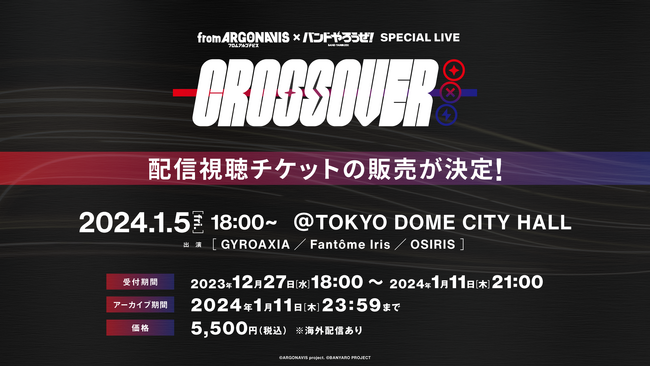 株式会社ブシロード(本社:東京都中野区、代表取締役社長:木谷高明)のグループ会社にあたる株式会社アルゴナビス(本社:東京都中野区、代表取締役社長:北岡那之)は、「from ARGONAVIS × バンドやろうぜ! SPECIAL LIVE - CROSSOVER -」開催についてご報告いたします。