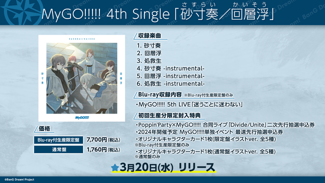 ◇タイトル:MyGO!!!!! 4th Single「砂寸奏/回層浮」(読み:さすらい/かいそう)