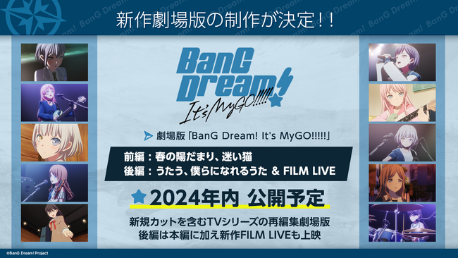 昨年夏に放送しました、TVアニメ「BanG Dream! It's MyGO!!!!!」の新作劇場版となる、劇場版「BanG Dream! It's MyGO!!!!!」の制作が決定いたしました。