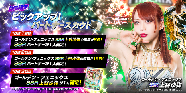 新日SSは2024年1月10日(水)メンテナンス終了後から、STARDOMより新規SSRパートナーとして、SSR「[ゴールデン・フェニックス]上谷沙弥」が登場する「STARDOM限定!ピックアップ!パートナースカウト」を開催しております。本スカウトは、10連スカウトを既定回数行うと、ラインナップに含まれるSSRパートナーからいずれか1人を確定で獲得できる仕様です。また、今回初登場するSSR「[ゴールデン・フェニックス]上谷沙弥」は、ピックアップ対象として、スカウトのプレイ回数に関わらずスカウト確率が通常の5倍となっています。