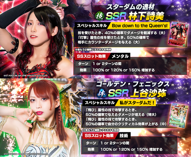 株式会社ブシロード(本社:東京都中野区、代表取締役社長:木谷高明)は、株式会社ドリコム(本社:東京都品川区、代表取締役社長:内藤裕紀)と共同開発しているスマートフォンゲームアプリ『新日本プロレスSTRONG SPIRITS』(以下、新日SS)にて、2024年1月10日(水)メンテナンス終了後より、新規SSRパートナーとして「[スターダムの逸材]林下詩美」と「[ゴールデン・フェニックス]上谷沙弥」が、STARDOM限定の各スカウトにて登場しました。さらに、全ユーザーにダイヤ1500個を配布致しました。