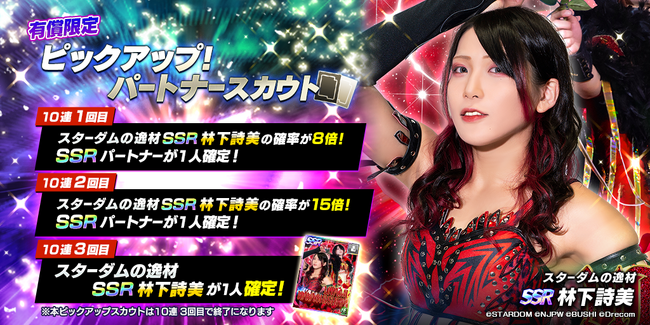 新日SSは2024年1月10日(水)メンテナンス終了後から、STARDOMより新規SSRパートナーとして、SSR「[スターダムの逸材]林下詩美」が登場する「STARDOM限定!ピックアップ!パートナースカウト」を開催しております。本スカウトは、10連スカウトを既定回数行うと、ラインナップに含まれるSSRパートナーからいずれか1人を確定で獲得できる仕様です。また、今回初登場するSSR「[スターダムの逸材]林下詩美」は、ピックアップ対象として、スカウトのプレイ回数に関わらずスカウト確率が通常の5倍となっています。