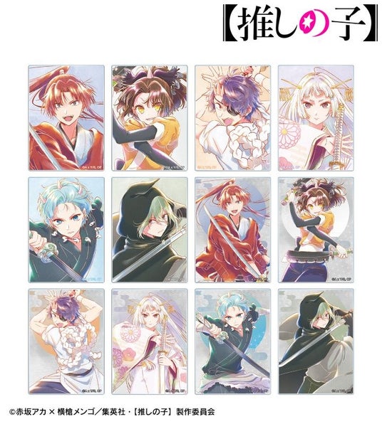 姫川大輝(ブレイドver.)、有馬かな(ツルギver.)、鳴嶋メルト(キザミver.)、黒川あかね(鞘姫ver.)、アクア(刀鬼ver.)、鴨志田朔夜(匁ver.)のイラストを新たなタッチで魅力的に表現し、作中で登場する舞台をイメージしたデザインのアクリルカードに仕上げました。