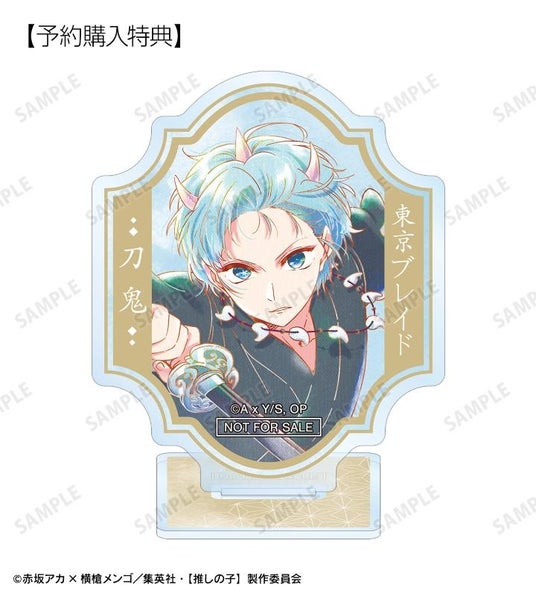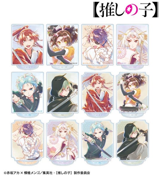 姫川大輝(ブレイドver.)、有馬かな(ツルギver.)、鳴嶋メルト(キザミver.)、黒川あかね(鞘姫ver.)、アクア(刀鬼ver.)、鴨志田朔夜(匁ver.)のイラストを新たなタッチで魅力的に表現し、作中で登場する舞台をイメージしたデザインのアクリルスタンドに仕上げました。