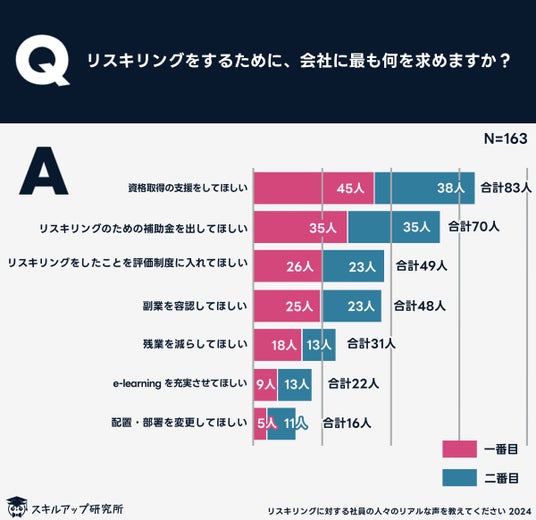 リスキリングをする際に、労働者が会社に求めることは「資格取得の支援」が最も多く、次いで「リスキリングのための補助金」だった。