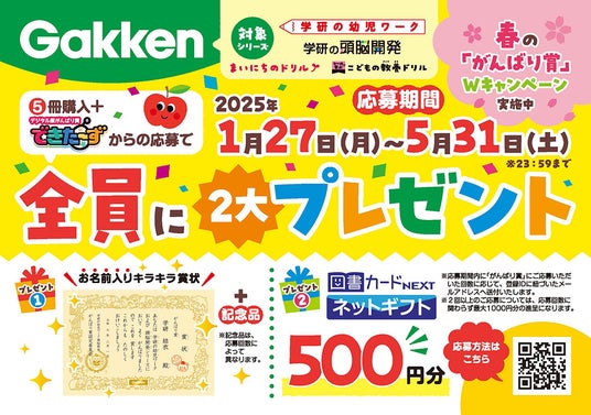 株式会社 学研ホールディングス(東京・品川/代表取締役社長:宮原博昭)のグループ会社、株式会社 Gakken(東京・品川/代表取締役社長:南條達也、以下Gakken)は、2025年5月31日(土)まで、「Gakken 幼児ワーク 春の「がんばり賞」Wキャンペーン」を開催中です。