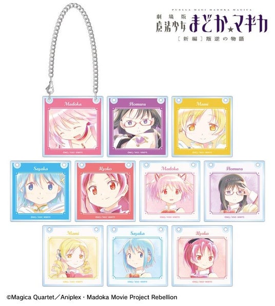 鹿目まどか、暁美ほむら、巴マミ、美樹さやか、佐倉杏子のイラストを新たなタッチで魅力的に表現し、アクリルのドアプレート風チャームに仕上げました。20cmのチェーンが付属しております。