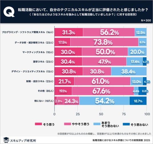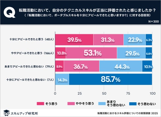 「転職活動において、自分のテクニカルスキルが正当に評価されたと感じましたか?」という質問に対し、プログラミング・ソフトウェア開発スキルやデータ分析・統計解析スキルを強みとしてアピールした転職者の85%以上が「評価されたと思う・やや思う」と回答した。
