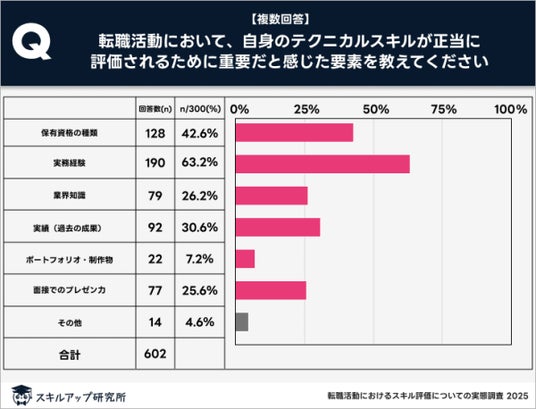 また、「転職活動において、自身のテクニカルスキルが正当に評価されるために重要だと感じた要素を教えてください(複数回答可)」という質問では、約6割が「実務経験」を、約4割が「保有資格の種類」を挙げた。