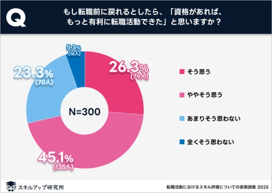 「もし転職前に戻れるとしたら、『資格があれば、もっと有利に転職活動できた』と思いますか?」という問いに対し、7割以上が「そう思う・ややそう思う」と回答した