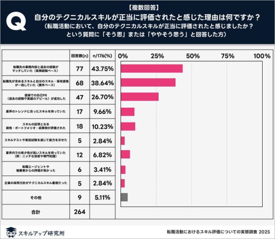 「転職活動において、自分のテクニカルスキルが正当に評価されたと感じた理由は何ですか?」という質問に対し、最も多かった回答は「転職先の業務内容と過去の経験がマッチしていた(実務経験ベース)」であり、「転職先が求めるスキルと自分のスキル・保有資格が一致していた(要件ベース)」が次に続いた。