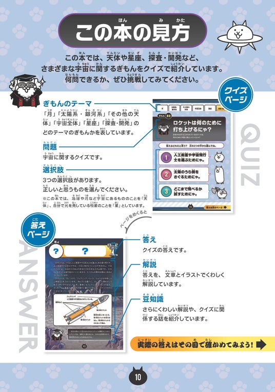 ▲大人気ゲームアプリ「にゃんこ大戦争」のキャラクターたちと、宇宙について学べるクイズブックが新登場!