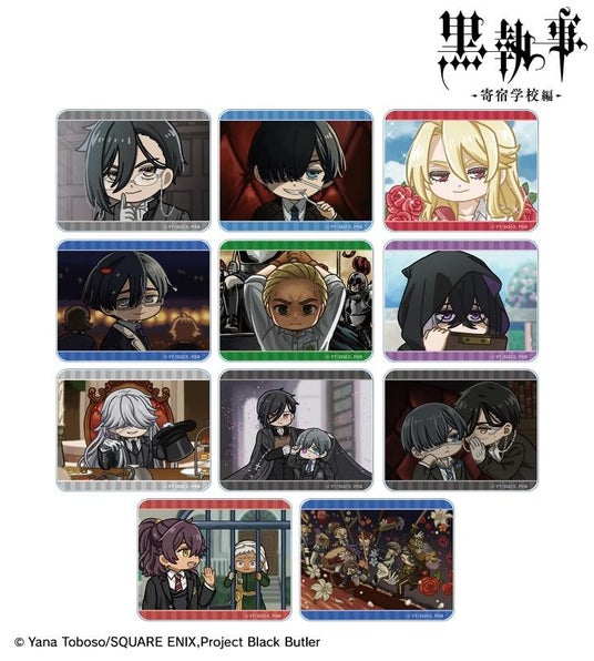 種類 :全11種(セバスチャン・ミカエリス、シエル・ファントムハイヴ、エドガー・レドモンド、ロレンス・ブルーアー、ハーマン・グリーンヒル、グレゴリー・バイオレット、葬儀屋、セバスチャン&シエル ver.A、セバスチャン&シエル ver.B、ソーマ&アグニ、集合)