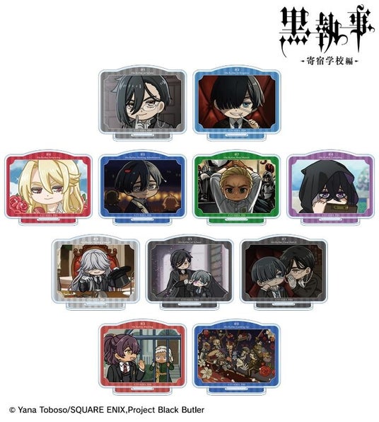 セバスチャン・ミカエリス、シエル・ファントムハイヴ、エドガー・レドモンド、ロレンス・ブルーアー、ハーマン・グリーンヒル、グレゴリー・バイオレット、葬儀屋、ソーマ・アスマン・カダール、アグニの印象的なシーンを、そのままデフォルメで再現し、アクリルスタンドに仕上げました。