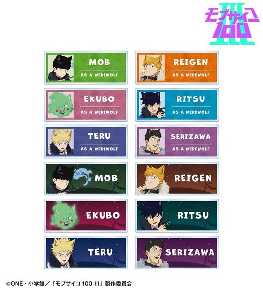 影山茂夫、霊幻新隆、エクボ、影山律、花沢輝気、芹沢克也の描き下ろしイラスト、キャラクターの名前をアクリルネームプレートに仕上げました。