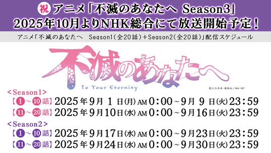 『不滅のあなたへ Season3』が10月4日より NHK 総合テレビにて毎週土曜夜11時45分から放送開始予定。これを記念しまして、講談社が運営するYouTubeチャンネル「フル☆アニメTV」にて、アニメ『不滅のあなたへ Season1(全20話)&Season2(全20話)』を期間限定で順次無料配信いたします。Season1【1~10話】を本日9月1日から9月9日まで、Season1【11~20話】を9月10日から9月16日まで、Season2【1~10話】を9月17日から9月23日まで、Season2【11~20話】を9月24日から9月30日までの期間限定配信となりますので、ぜひお楽しみください!