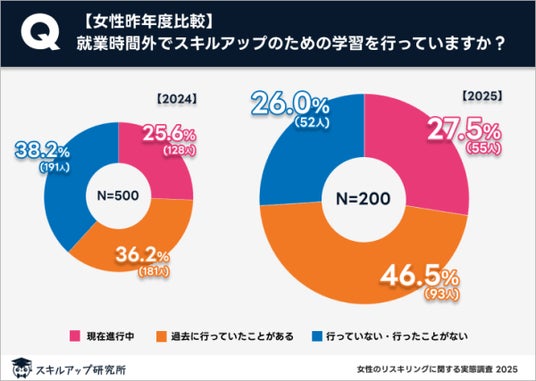 しかし、去年の結果と比較すると、リスキリングを行っている・過去に行っていたことがある女性の割合は61.8%(2024時調査)から74.0%(2025年、今回)に増加している。世の中のリスキリングへの意識の高まりを反映しているといえる。