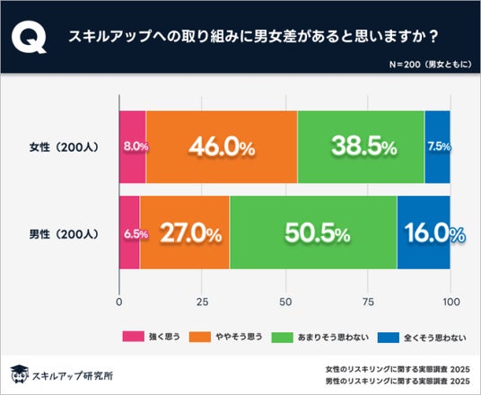 女性の方が男性よりも「スキルアップへの取り組みに男女差がある」と思う割合が高いことがわかった。