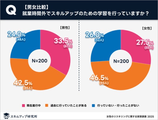 リスキリング(就業時間外のスキルアップ)に取り組んでいる女性は約27.5%であった。これは、男性の取り組み率である33.5%と比較して低い数値となっている。