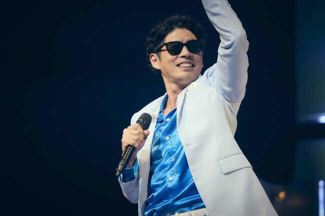絶妙に歌と動きを押し引きしつつ続けられたのは、誰ものハートを撃ち抜く「ポーカーフェイス」。妖艶な歌にサックスソロが彩りを加えていく。花言葉でありカクテルの名前でもある「ミモザ」では、黒沢 薫の突き抜けるハイトーンヴォイスにキーボードのフレーズも重なり、冒頭から会場を陶酔させる。
