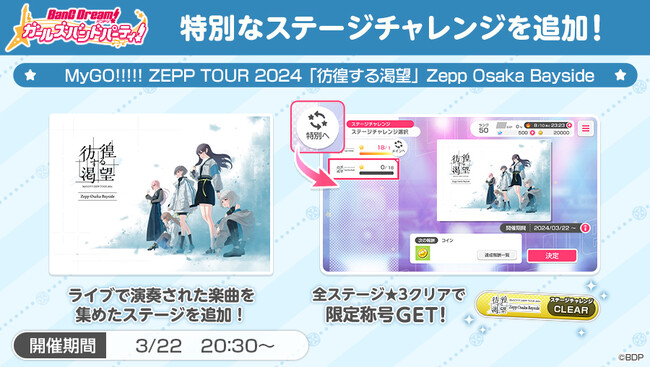 今回のライブで演奏した楽曲を集めた特別ステージを、スマートフォン向けゲーム「バンドリ! ガールズバンドパーティ!」内、ステージチャレンジ機能に追加いたしました。
