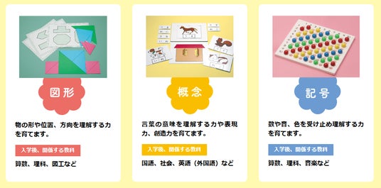 めばえ教室は「図形」「概念」「記号」といった3つの知能の柱で、物事を考えるための基礎をつくります。しっかりとしたカリキュラムのもと、一人一人の個性に合わせた指導で「3つの知能の柱」を高めて、楽しく遊びながら知能を伸ばします。
