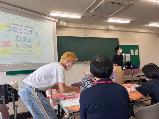 株式会社 学研ホールディングス(東京・品川/代表取締役社長:宮原博昭)のグループ会社、メディカル・ケア・サービス株式会社(埼玉・さいたま市/代表取締役社長:山本教雄)が運営する認知症対応型共同生活介護(グループホーム)の「愛の家グループホーム小平上水南」(東京都小平市)のご利用者が、5月21日(水)に、白梅学園大学の学生が主催する「コミュニティ・カフェ」に参加しました。当日は学生と認知症のあるご利用者が、学生が企画・準備したレクリエーションなどを一緒に行ったり学食で一緒にランチをするなど、多世代交流をしました。