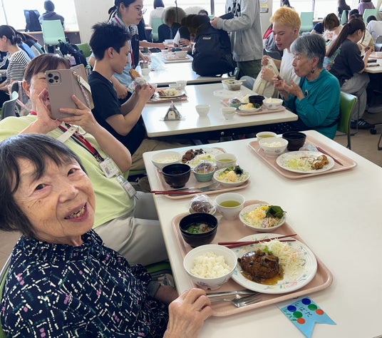 コミュニティ・カフェのあとは、毎回、白梅学園大学の学食で学生とともにご利用者が一緒にランチを楽しんでいます。普段なかなか入ることのない大学の学食で、学生の中に混ざって話をしながら食事をとることで、ご利用者の活気や楽しみにもつながっています。