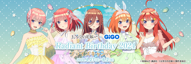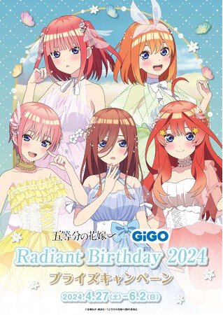 株式会社ブシロード(本社:東京都中野区、代表取締役社長:木谷高明)のグループ会社にあたる株式会社ブシロードクリエイティブ(本社:東京都中野区、代表取締役社長:成田耕祐)は、4月27日(金)より対象のGiGOグループのお店にて『五等分の花嫁∽ × GiGO Radiant Birthday 2024』の期間限定イベントを開催いたします。