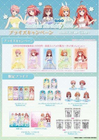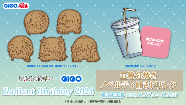 対象のGiGOグループのお店にて『五等分の花嫁∽ × GiGO Radiant Birthday 2024』の開催が決定!描きおろしイラストを使用したプライズ景品に加えて五等分焼き&ノベルティ付きドリンクの販売を行います。