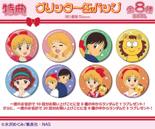 一度のお会計で10回分ご購入ごとに特典グリッター缶バッジ(全8種)の中からランダムで1つ、20回分ご購入ごとにランダムで3つプレゼント!