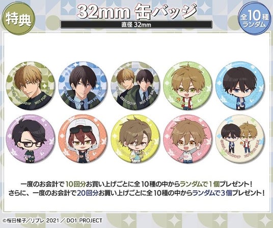 一度のお会計で10回分ご購入ごとに特典32mm缶バッジ(全10種)の中からランダムで1個、20回分ご購入ごとにランダムで3個プレゼント!
