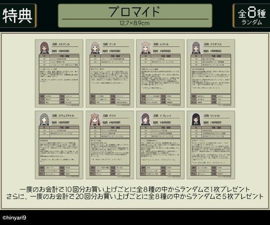 一度のお会計で10回分ご購入ごとに特典ブロマイド(全8種)の中からランダムで1枚、20回分ご購入ごとにランダムで5枚プレゼント!