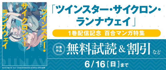 株式会社ブシロード(本社:東京都中野区、代表取締役社長:木谷高明)のグループ会社にあたる株式会社ブシロードワークス(本社:東京都中野区、代表取締役社長:新福恭平)は、「コミックグロウル」にて好評連載中の『ツインスター・サイクロン・ランナウェイ』第1巻が本日6月7日(金)に発売することをご案内致します。また、発売を記念した電子書籍フェアも実施中です。