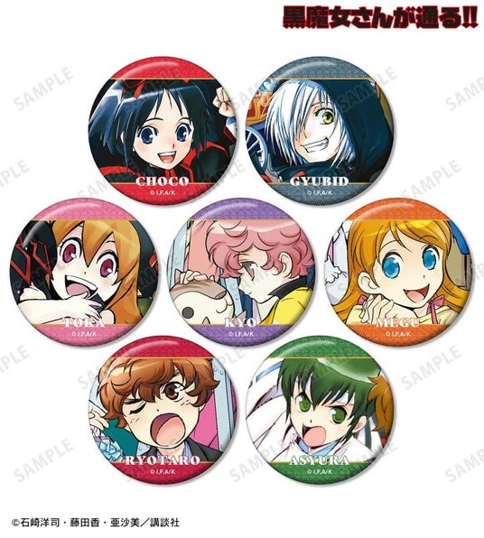 黒鳥千代子、ギュービッド、桃花・ブロッサム、大形 京、紫苑メグ、麻倉良太郎、東海寺阿修羅のイラストを、グリッター加工を施した缶バッジに仕上げました。