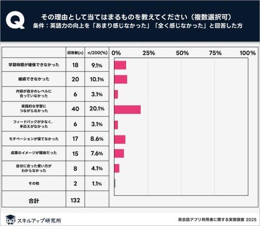 英語力の向上を「あまり感じなかった」「まったく感じなかった」と回答した人にその理由を尋ねたところ、最も多かったのは「実践的な学習につながらなかった」だった。