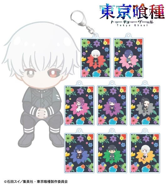 金木 研、霧嶋董香、神代利世、月山 習、ウタ、霧嶋絢都、亜門鋼太朗、鈴屋什造のイラストをボタニカルデザインに落とし込んで繊細なタッチで新たに描き起こし、アクリルキーホルダーに仕上げました。