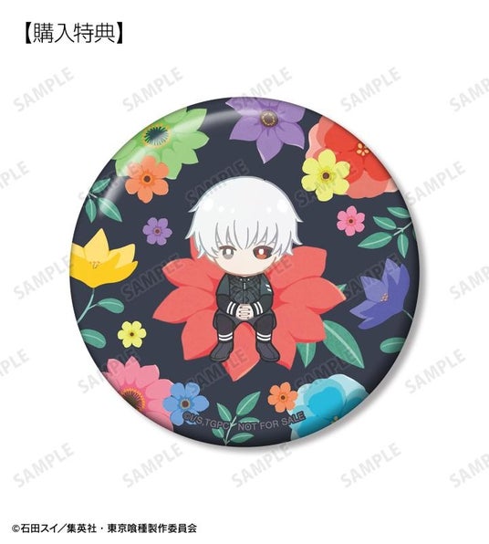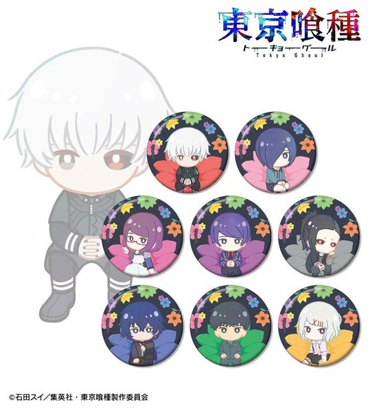 金木 研、霧嶋董香、神代利世、月山 習、ウタ、霧嶋絢都、亜門鋼太朗、鈴屋什造のイラストをボタニカルデザインに落とし込んで繊細なタッチで新たに描き起こし、缶バッジに仕上げました。