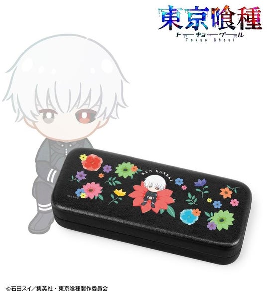金木 研、霧嶋董香、神代利世、月山 習、ウタ、霧嶋絢都、亜門鋼太朗、鈴屋什造のイラストをボタニカルデザインに落とし込んで繊細なタッチで新たに描き起こし、メガネケースに仕上げました。