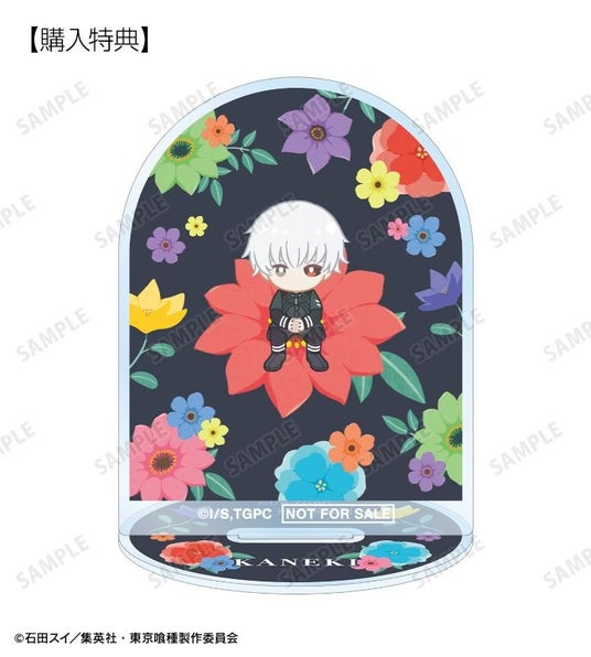 金木 研、霧嶋董香、神代利世、月山 習、ウタ、霧嶋絢都、亜門鋼太朗、鈴屋什造のイラストをボタニカルデザインに落とし込んで繊細なタッチで新たに描き起こし、アクリルスタンドに仕上げました。