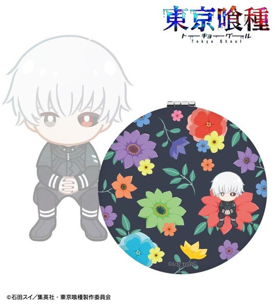 金木 研、霧嶋董香、神代利世、月山 習、ウタ、霧嶋絢都、亜門鋼太朗、鈴屋什造のイラストをボタニカルデザインに落とし込んで繊細なタッチで新たに描き起こし、折りたたみミラーに仕上げました。