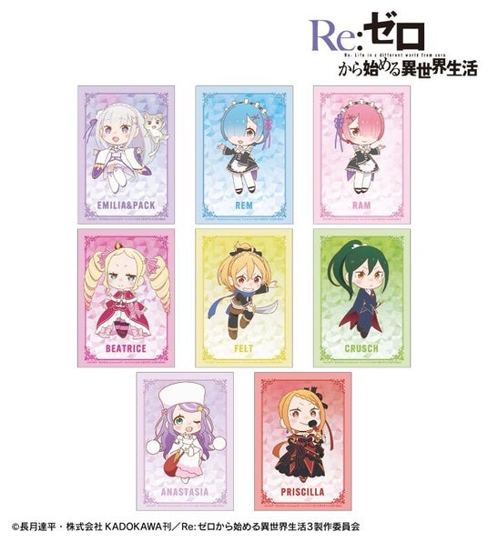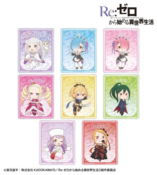 エミリア&パック、レム、ラム、ベアトリス、フェルト、クルシュ・カルステン、アナスタシア・ホーシン、プリシラ・バーリエルのちびキャライラストをメインにデザインし、アクリルカードに仕上げました。