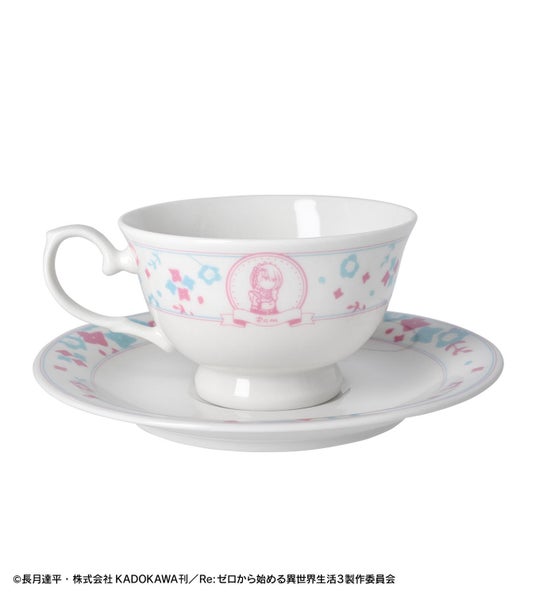 レム、ラムのイラストと、花と髪飾りのモチーフをボタニカルデザインに落とし込んで繊細なタッチで新たに描き起こし、カップ&ソーサーに仕上げました。