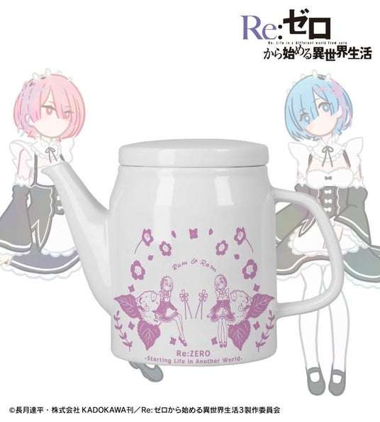 レム、ラムのイラストと、花と髪飾りのモチーフをボタニカルデザインに落とし込んで繊細なタッチで新たに描き起こし、ティーポットに仕上げました。