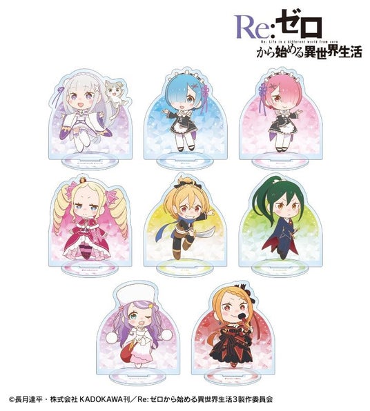 エミリア&パック、レム、ラム、ベアトリス、フェルト、クルシュ・カルステン、アナスタシア・ホーシン、プリシラ・バーリエルのちびキャライラストをメインにデザインし、アクリルスタンドに仕上げました。