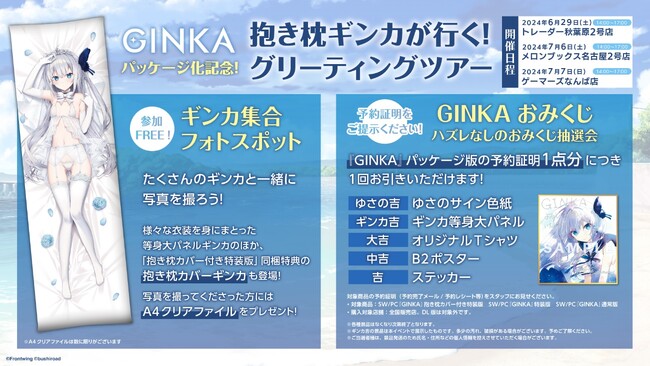 株式会社ブシロード(本社:東京都中野区 代表取締役社長:木谷高明、以下、ブシロード)は、Nintendo Switch(TM)版・PCパッケージ版が予約受付中のビジュアルノベルゲーム『GINKA』のイベント「抱き枕ギンカが行く!グリーティングツアー」の開催を発表いたしました。