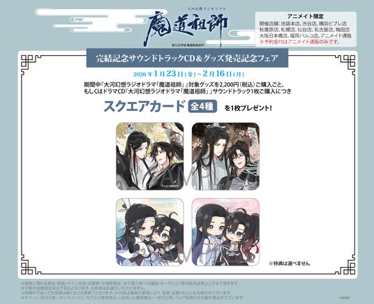 期間中「大河幻想ラジオドラマ『魔道祖師』」の対象グッズをご購入2,200円(税込)毎、対象CDをご購入1点毎にスクエアカード(全4種)を1枚プレゼント!